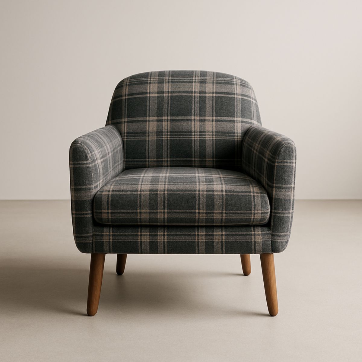 Fauteuil en tissu à carreaux avec pieds en bois